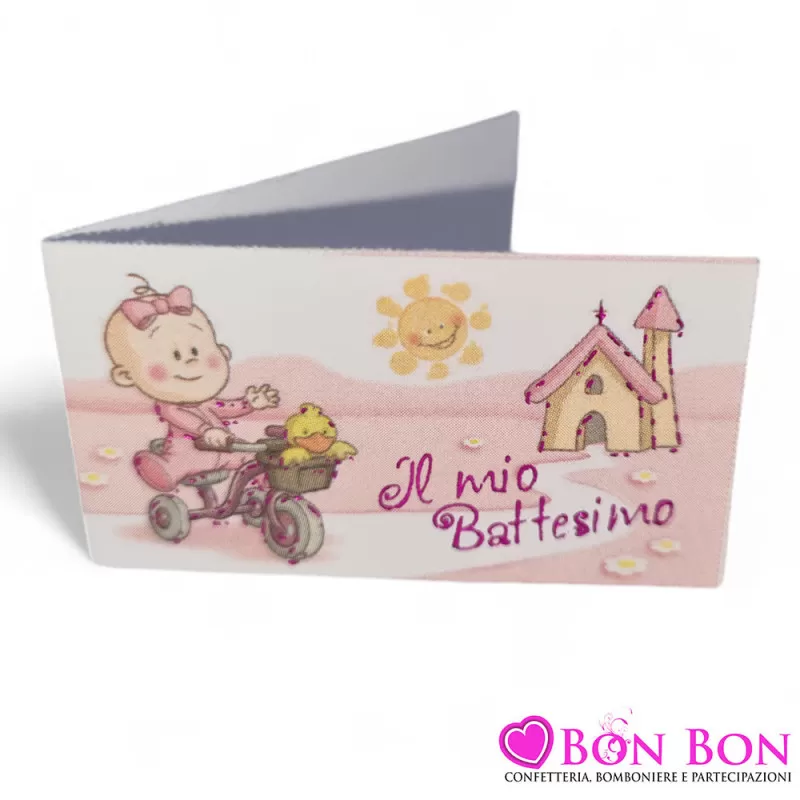 Confezione da 20 bigliettini con disegno bimba con triciclo e scritta a caldo il mio Battesimo in rosa, inclusi di stampa.