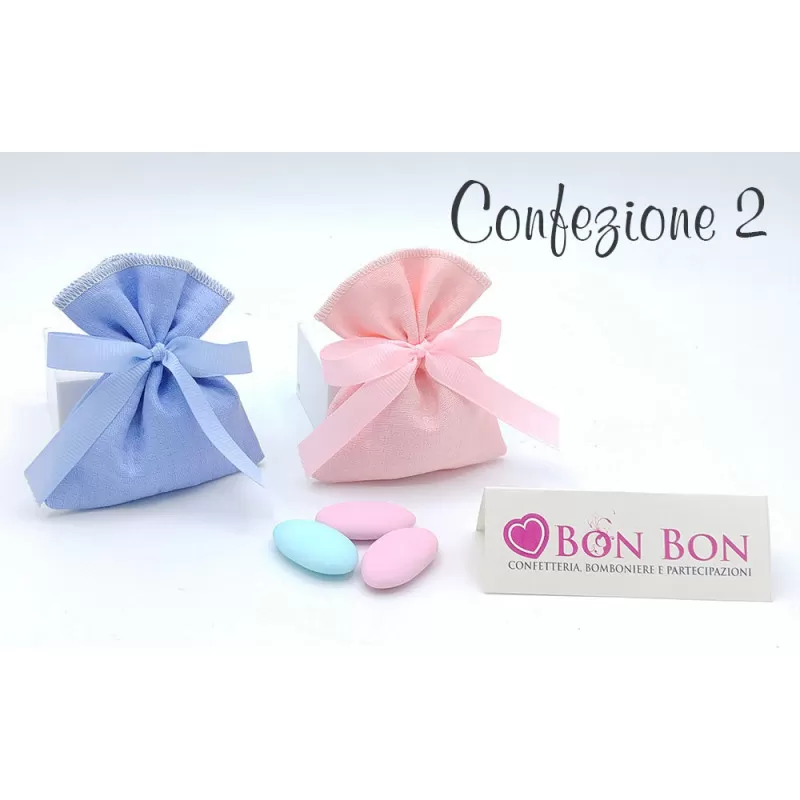 Possibilità di scegliere la confezione con scatola chiusa con nastro di colore a scelta e sacchetto con 5 confetti all'interno, o porta confetti trasparente.