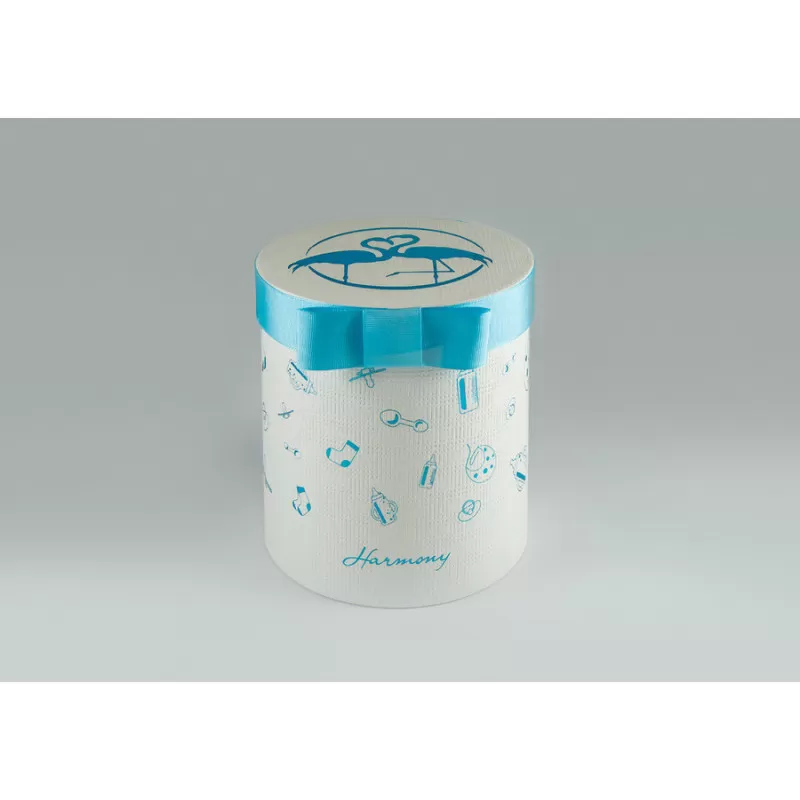 Nel prezzo è incluso l'astuccio cilindrico decorato, il sacchetto in rete celeste e i confetti da scegliere nell'opzione.