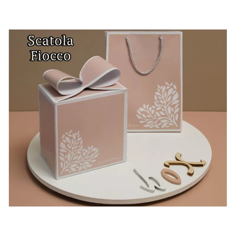 Possibilità di scegliere la scatola baby busta o in alternativa la scatola traforata con luce led, quella fiocco in colore tortora con disegno cuore o la scatola fiore 2023 in colore grigio.