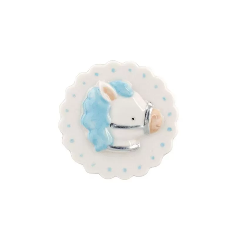 Non dimenticare di salvare la tua personalizzazione per poter riempire il carrelloBomboniera nascita e battesimo calamita cavallino a dondolo con sacchetto celeste confezionato con 5 confetti a scelta.