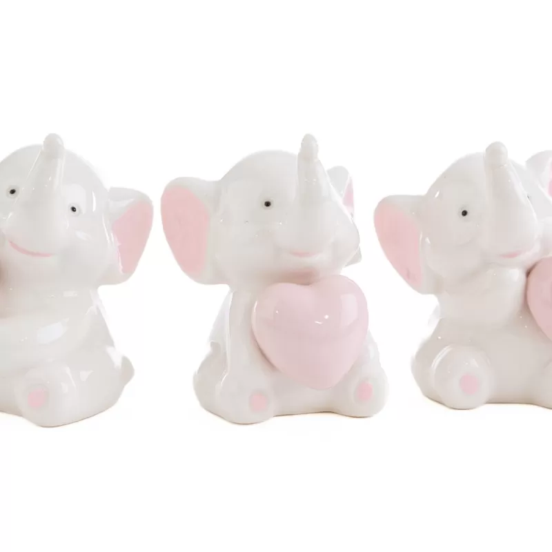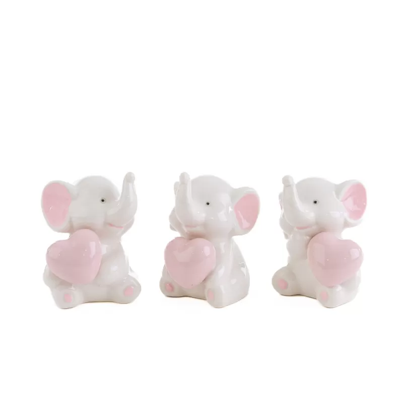 Bomboniera nascita e battesimo elefantino in porcellana rosa, 3 soggetti assortiti.