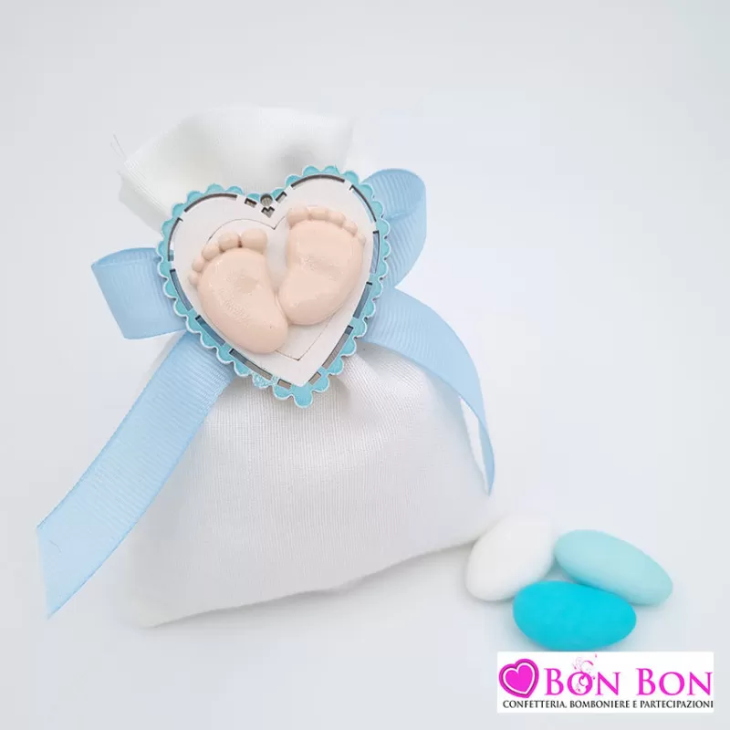 Bomboniera nascita e battesimo magnete cuore piedini boy con sacchetto panna e fiocco celeste.
