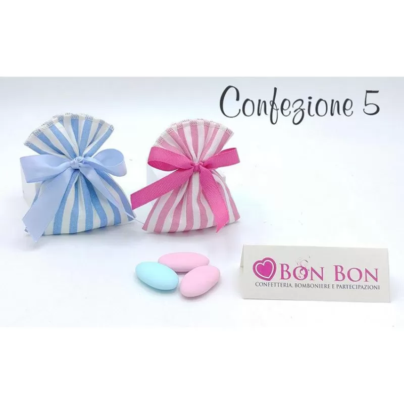 Dall'opzione è possibile scegliere la confezione tra le 6 disponibili (vedere foto) con sacchetto con all'interno 5 confetti a scelta e scatola in cartoncino panna chiusa con fiocco.