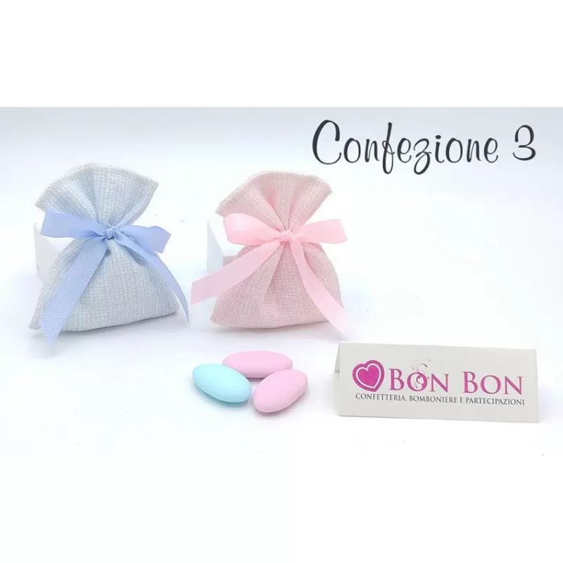 Dall'opzione è possibile scegliere la confezione tra le 6 disponibili (vedere foto) con sacchetto con all'interno 5 confetti a scelta e scatola chiusa con fiocco.