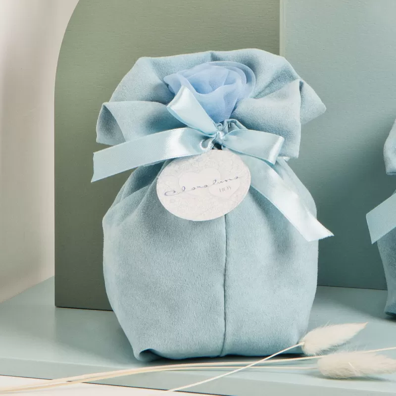Nel prezzo è incluso il sacchetto fagotto celeste con rosa, con 5 confetti per sacchetto, il tutto vi arriverà da confezionare.