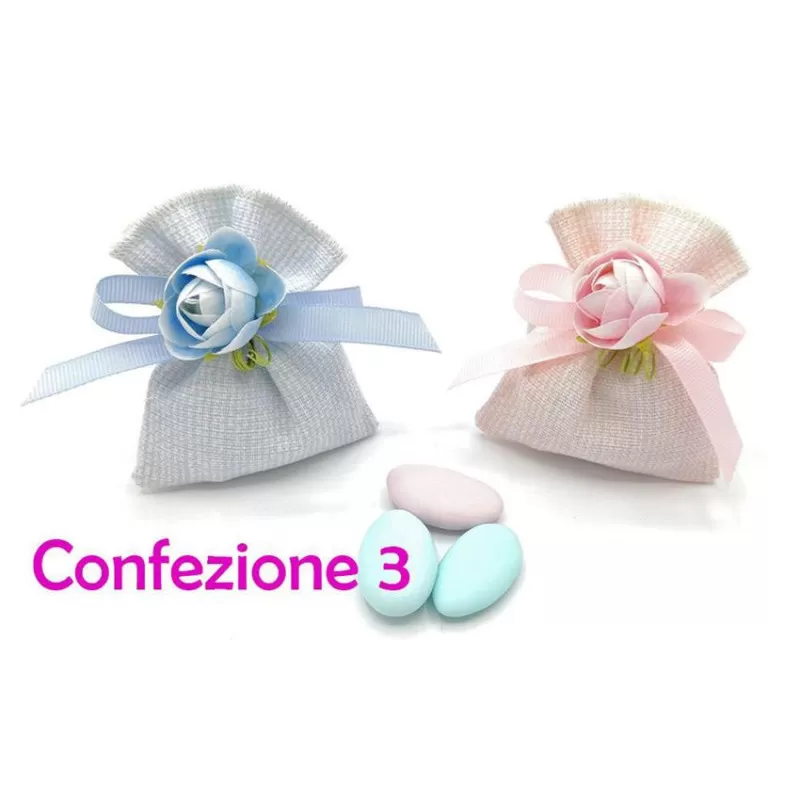 Possibilità di scegliere la confezione con scatola chiusa con nastro di colore a scelta e sacchetto da scegliere dall'opzione con 5 confetti all'interno.