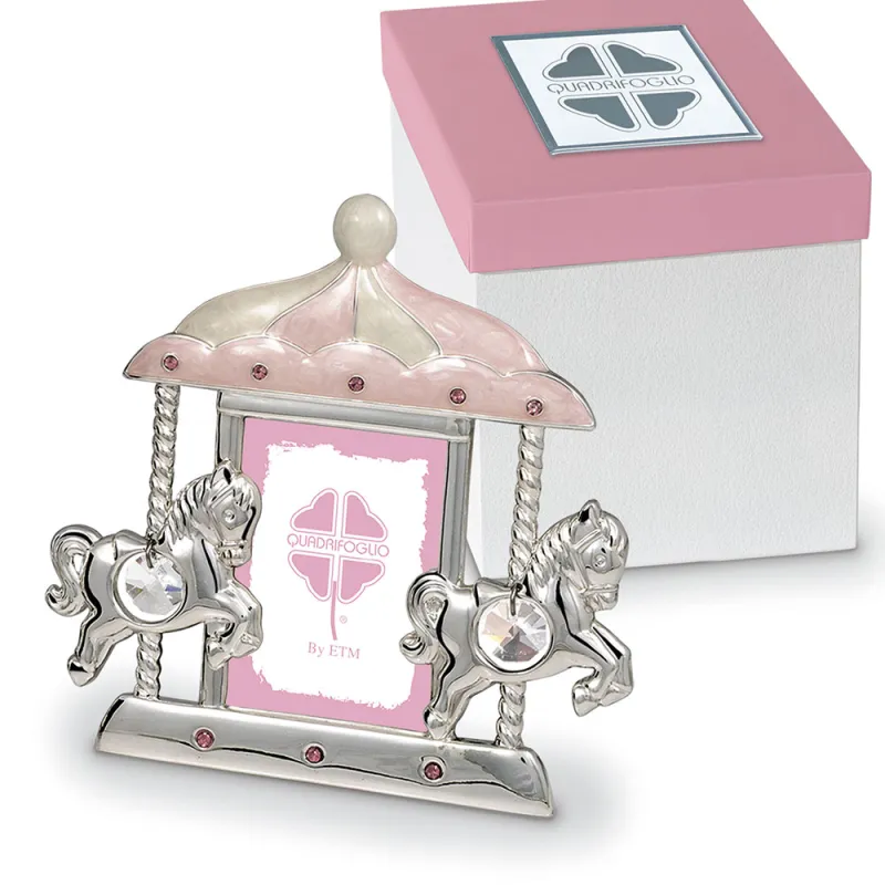 Bomboniera solidale Quadrifoglio® per battesimo bimba con portafoto giostra rosa e cavallucci argentati, completa di scatola abbinata e personalizzabile.