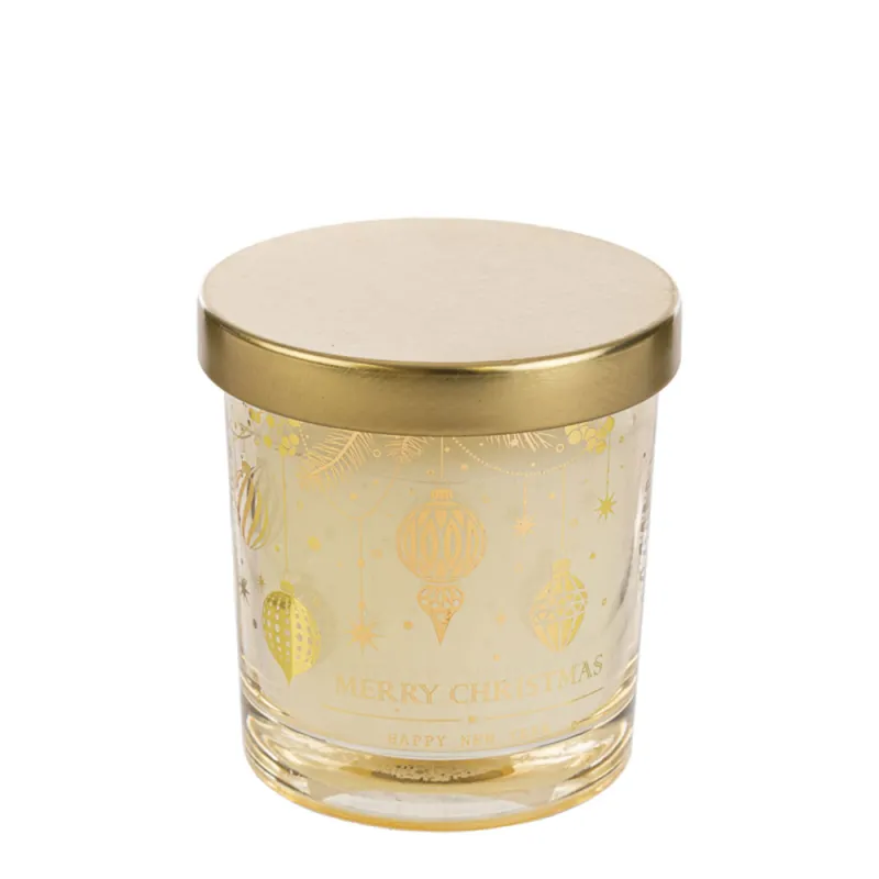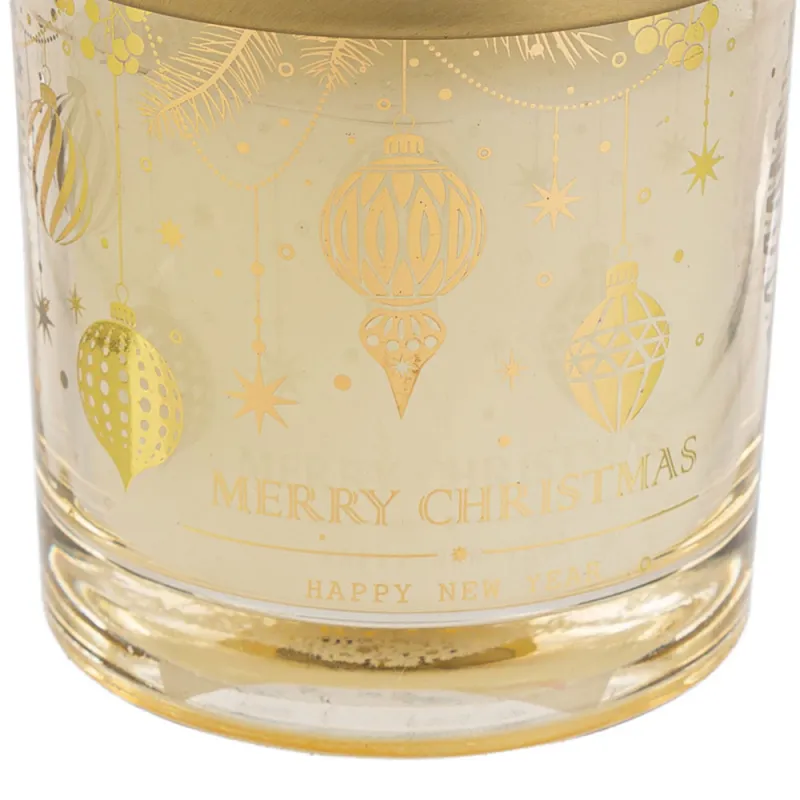 La candela è contenuta in un barattolo trasparente dal design moderno, impreziosito da decori dorati natalizi come palline, stelle e rami di pino, con tappo coordinato color oro satinato. Un oggetto elegante che unisce lo spirito festivo alla praticità, trasformandosi in un profumatore d’ambiente decorativo anche dopo l’uso.