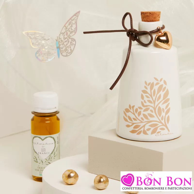 Bomboniera Matrimonio Enogastronomica Claraluna 2025 - Oliere in Porcellana con Cuore Albero della Vita con olio