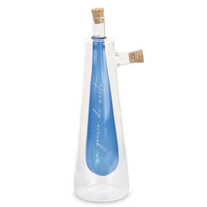 Realizzata in vetro trasparente di qualità, questa bottiglia presenta un originale serbatoio interno di colore blu, dedicato all’aceto, con la romantica scritta nera “un goccio di aceto”. Il contenitore esterno può essere riempito con l’olio, creando un pratico set olio/aceto in un unico pezzo. I due tappi in sughero naturale chiudono ermeticamente le aperture, preservando al meglio aromi e fragranze e rendendo l’oliera acetiera 2 in 1 perfetta per l’uso quotidiano in cucina.
