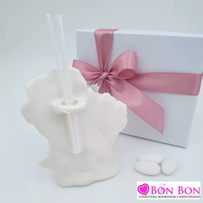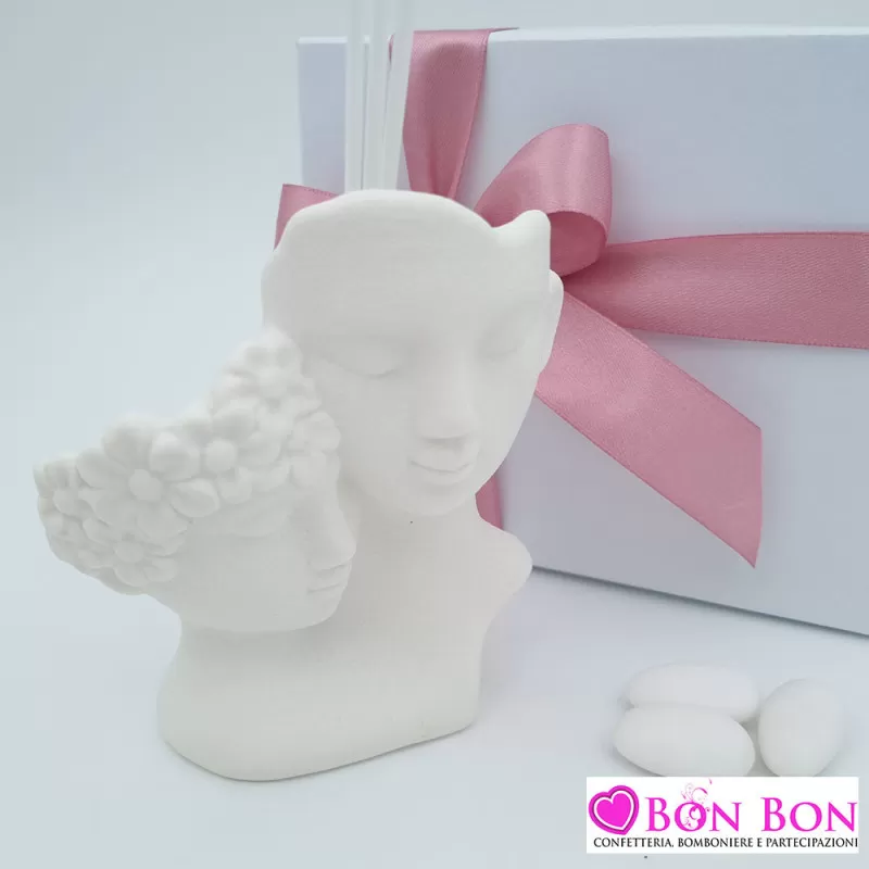 Bomboniera matrimonio profumatore coppia amanti in porcellana bianca opaca, comprensiva di scatola rivestita e bacchette bianche senza essenza.