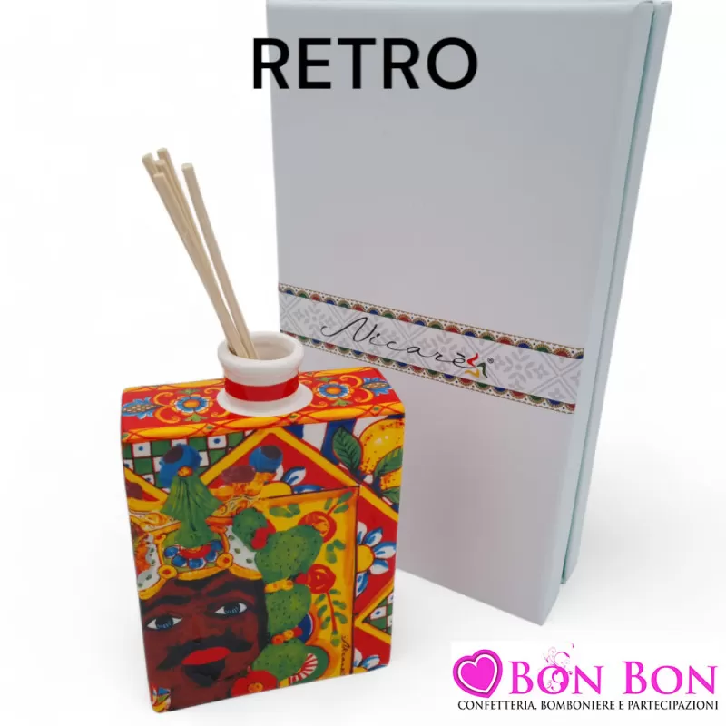 Il profumatore è dotato di stecche in legno senza profumo, che ti permettono di personalizzare la fragranza secondo i tuoi gusti. Viene presentato in una scatola rigida con richiamo siciliano, rivestita internamente di raso per un tocco di classe e raffinatezza. La scatola si abbina perfettamente al tema, esaltando la bellezza del regalo e rendendolo pronto per essere donato con stile.