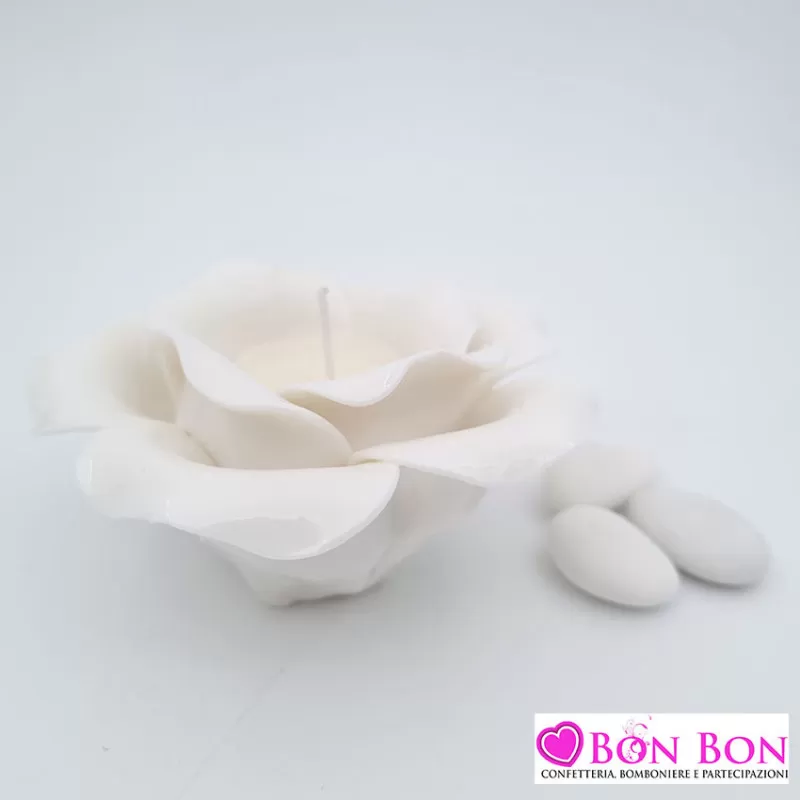 Bomboniera matrimonio candela profumata a forma di rosa bianca in porcellana lavorata, senza scatola.