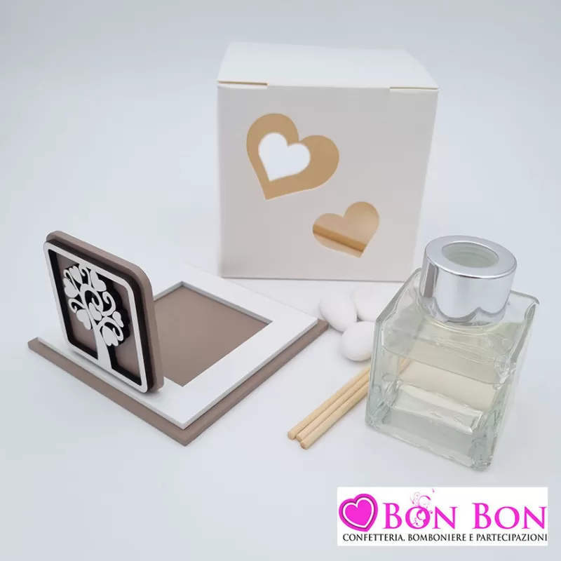 Bomboniera matrimonio profumatore con disegno albero della vita in legno colore tortora inclusa di bottiglia di forma cubica in vetro con all'interno l'essenza e i bastoncini in legno. La bomboniera è inclusa anche di astuccio in cartoncino panna traforata con cuori.