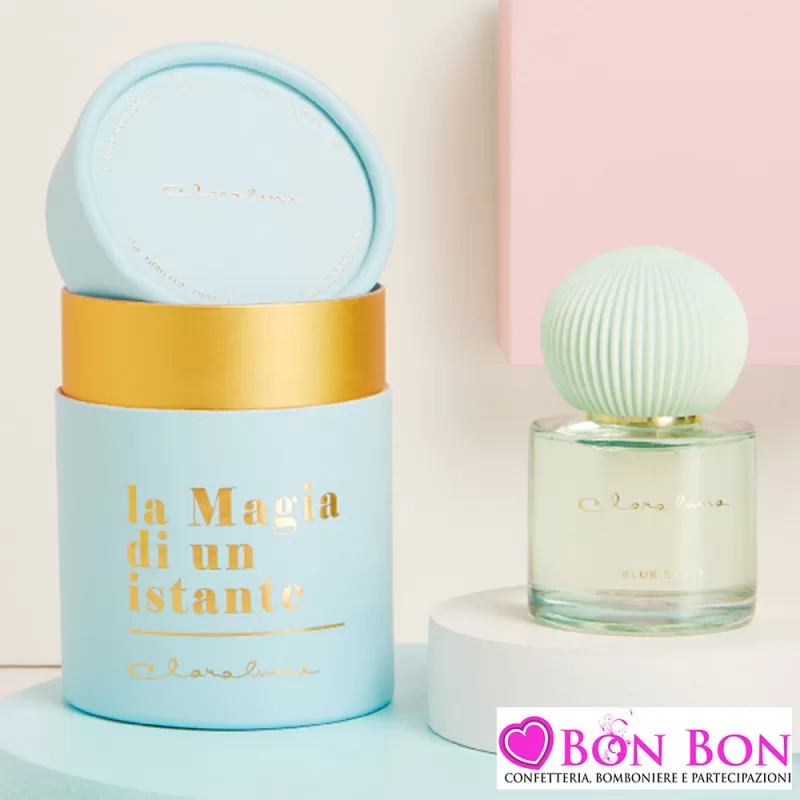 Ogni diffusore è confezionato in una scatola cilindrica azzurra con la frase dorata "La Magia di un istante", che richiama la bellezza e l'unicità di quel giorno speciale. Queste bomboniere matrimonio Claraluna 2025 è la scelta ideale per gli sposi che desiderano offrire un regalo utile e di classe, capace di evocare i profumi e i ricordi del giorno delle nozze ogni volta che viene utilizzato.