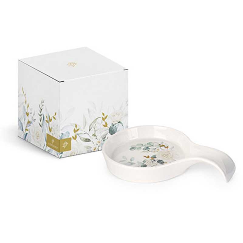 Bomboniere Matrimonio: Poggiamestolo Tondo con Manico in Porcellana Bianca, Motivo Floreale e Sfumature Oro
