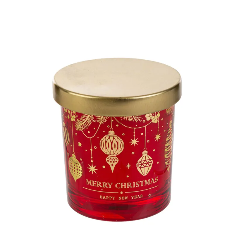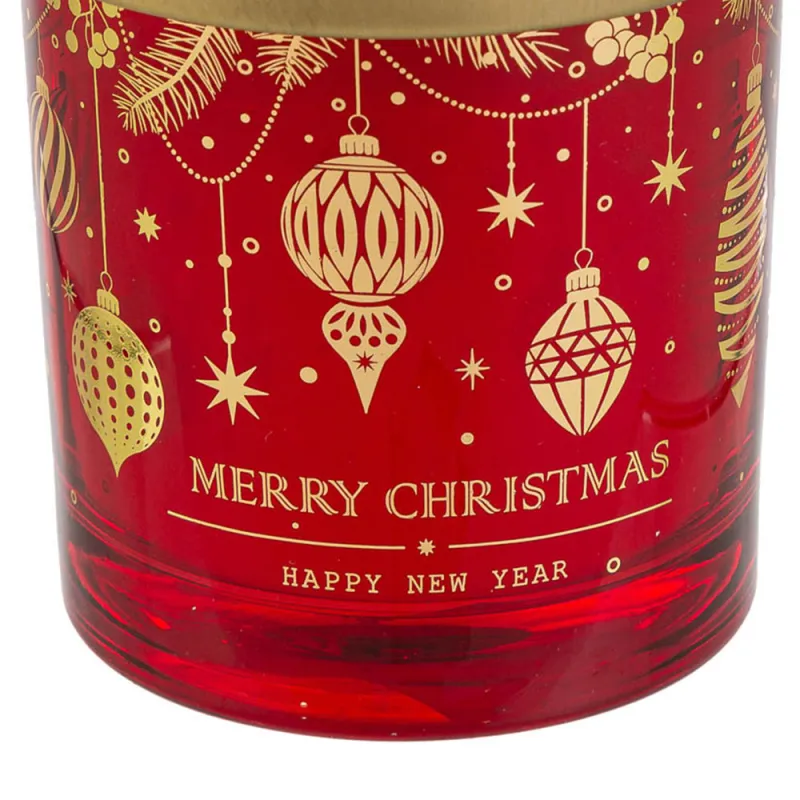 Candela profumata in vetro rosso con decori natalizi dorati, perfetta come bomboniera per matrimoni a tema Natale.