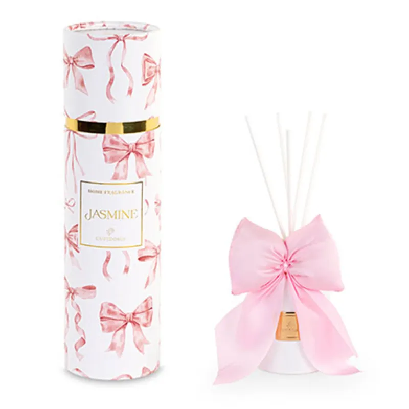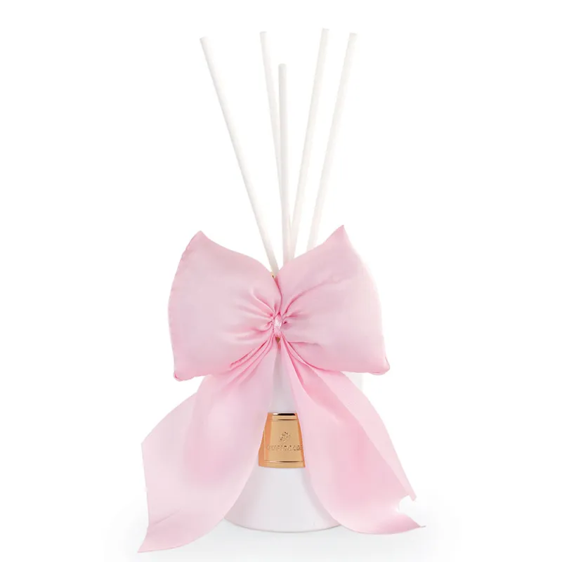 Diffusore per ambiente da 80 ml con grande fiocco rosa, scatola elegante inclusa e possibilità di confezione con confetti e bigliettino personalizzato per il matrimonio.