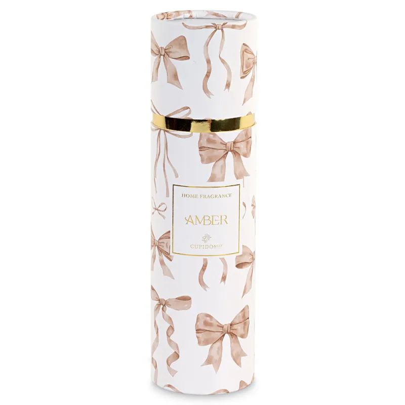 Il diffusore da 80 ml con fiocco rosa è già dotato di scatola coordinata a tubo, decorata con un elegante motivo di fiocchi tono su tono e dettagli oro: una confezione scenografica che rende questa bomboniera subito pronta da regalare o perfetta come base per ulteriori personalizzazioni.