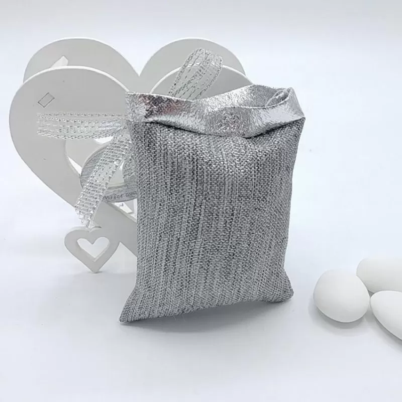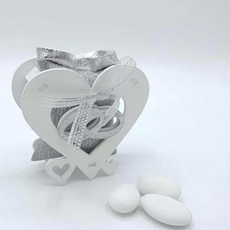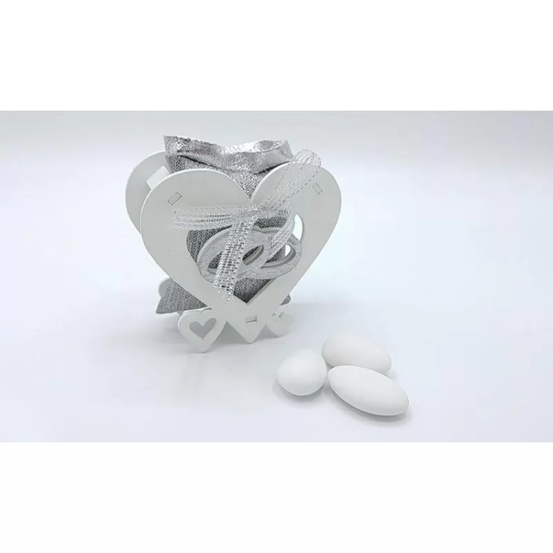 Scatoletta in legno a forma di cuore con bustina laminata argento con all'interno 5 confetti a scelta.