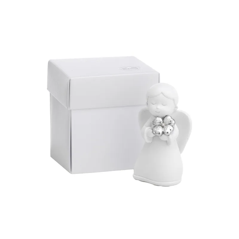 Bomboniera prima comunione angioletto in porcellana bianca con cuore argento, inclusa di scatola.
