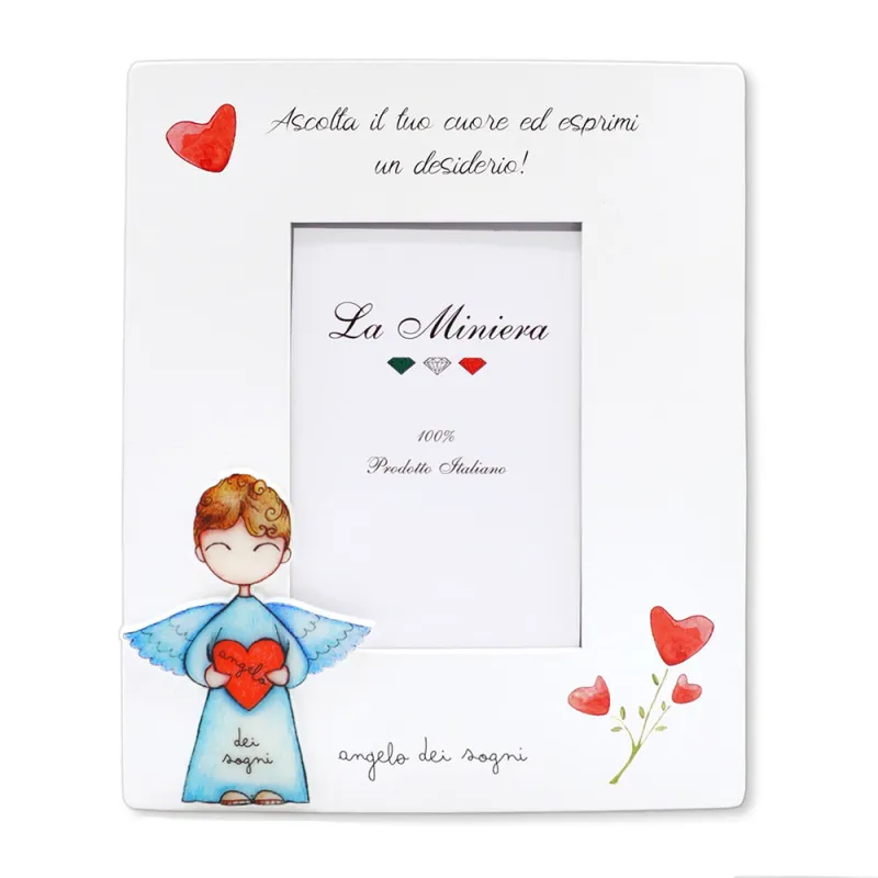 Scegli una bomboniera piena di dolcezza e significato con il portafoto verticale in legno con angelo e cuore, una proposta solidale perfetta per battesimo, nascita, Prima Comunione, Cresima o anniversari speciali. Il portafoto è realizzato in legno bianco e decorato frontalmente con un tenero angelo che stringe un cuore rosso tra le mani, accompagnato dalla frase “Ascolta il tuo cuore ed esprimi un desiderio!”. Il formato verticale valorizza la fotografia del tuo bambino o della tua famiglia e rende questo portafoto un complemento d’arredo elegante da esporre in casa. Puoi scegliere il decoro dell’angelo – ad esempio angelo dei sogni o angelo della fortuna – per adattare la bomboniera al messaggio che desideri trasmettere. Il portafoto viene fornito con scatola coordinata, pronto per diventare il protagonista delle tue bomboniere solidali a tema angeli.