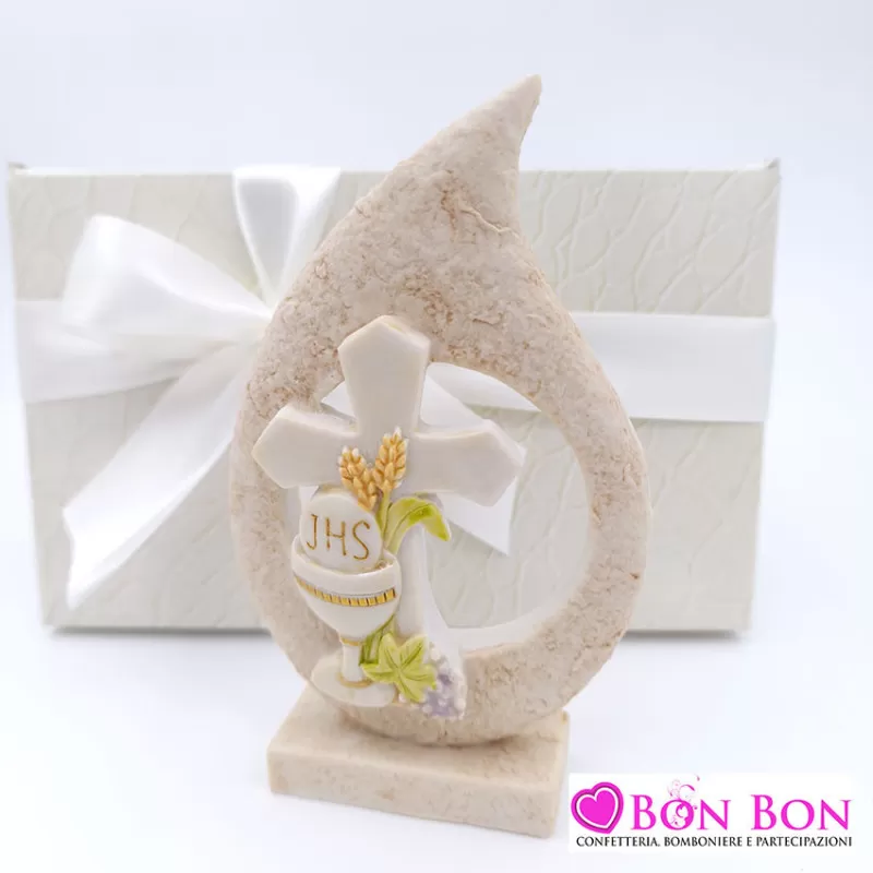 Bomboniere in offerta prima comunione icona goccia calice in resina, inclusa di astuccio chiusa con fiocco.