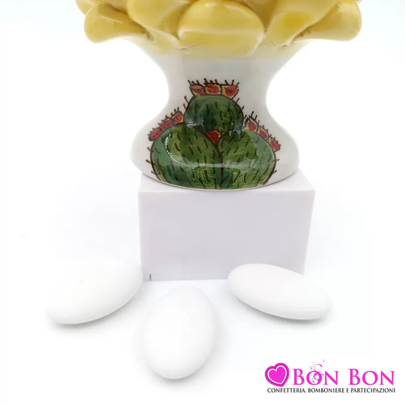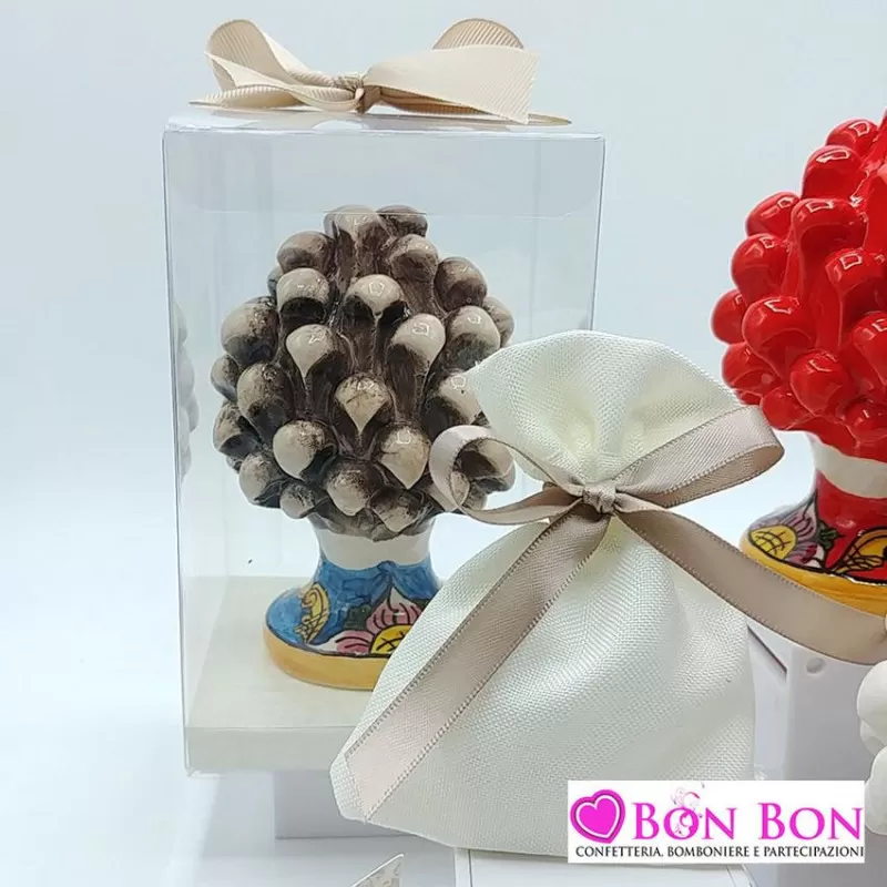 Bomboniera matrimonio tema siciliano pigna caltagirone in 6 colorazioni con base decoro fiori, paladino o ruota di carretto in ceramica dipinta a mano.