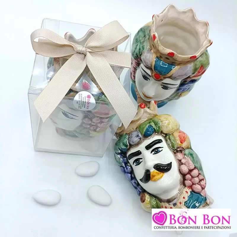 Bomboniera matrimonio tema siciliano testa di moro bifacciale colorata in porcellana dipinta a mano.