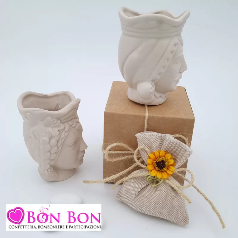 Bomboniera siciliana testa di moro caspò tortora lucida in ceramica di Caltagirone, confezionata con sacchetto tortora con girasole con all'interno 5 confetti a scelta con scatola trasparente con base panna e fiocco sulla scatola.
