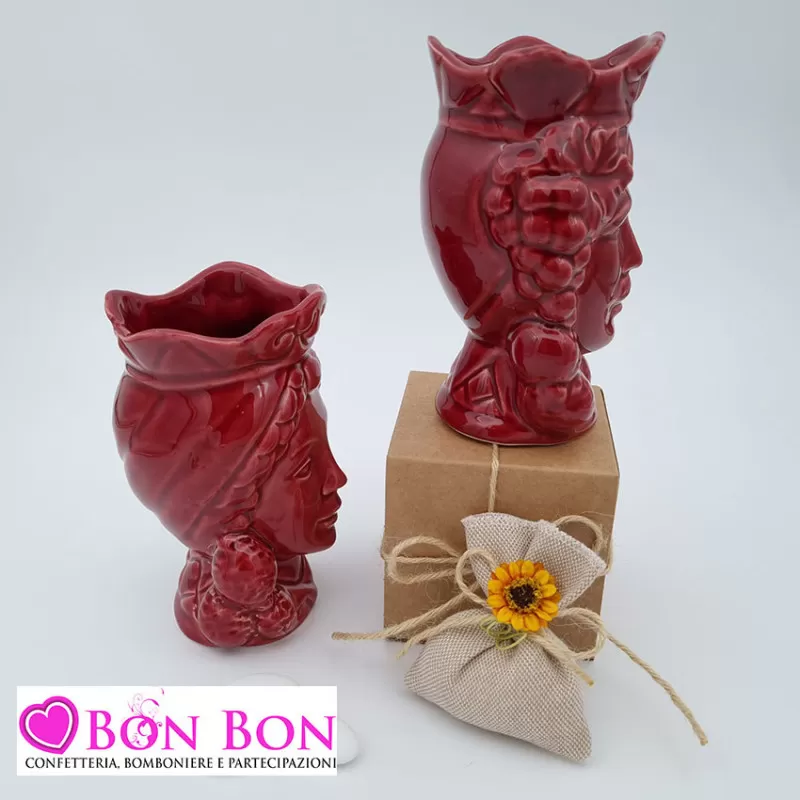 Bomboniera siciliana testa di moro con limoni bordeaux in ceramica di Caltagirone, confezionata con sacchetto tortora con girasole con all'interno 5 confetti a scelta con scatola trasparente con base panna e fiocco sulla scatola.