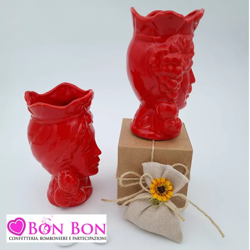 Bomboniera siciliana testa di moro con limoni rossa in ceramica di Caltagirone, confezionata con sacchetto tortora con girasole con all'interno 5 confetti a scelta con scatola trasparente con base panna e fiocco sulla scatola.