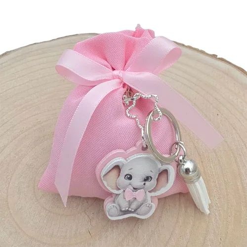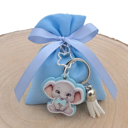 Sacchetto Nascita e Battesimo in Cotone Celeste con Portachiavi Elefantino e 5 Confetti Prezzo 2,30 €