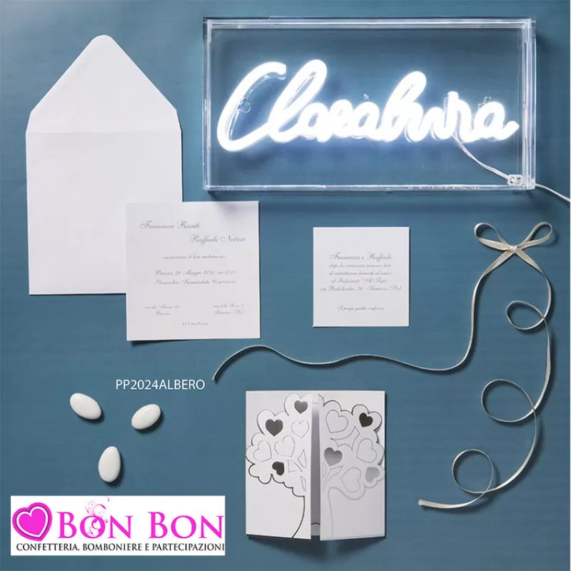 Facendo un ordine di minimo 50 bomboniere è inclusa in OMAGGIO 1 partecipazione e 2 bigliettini per i confetti per ogni bomboniera ordinata, stampa inclusa. (il montaggio delle partecipazioni è a vostro carico ne riceverete una montata).