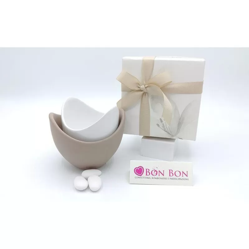 Bomboniera matrimonio Claraluna 2020 antipastiera a due in porcellana bianca e tortora e astuccio personalizzato Claraluna.