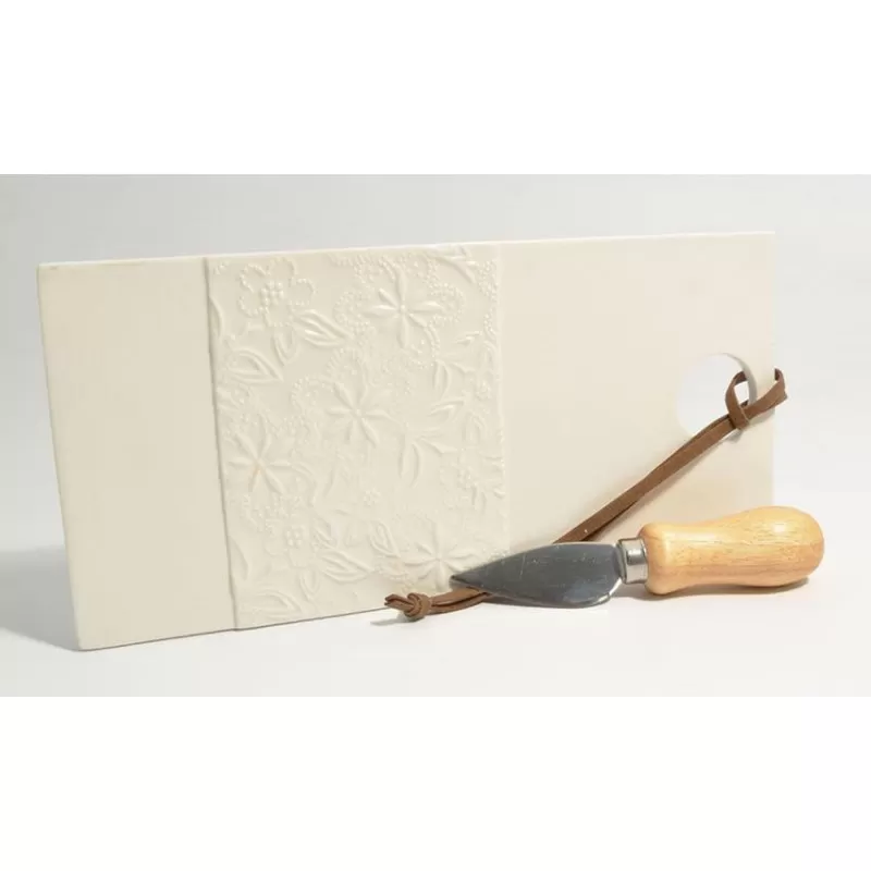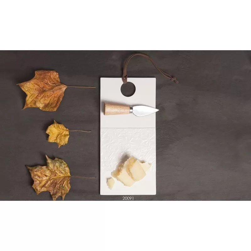 Bomboniera matrimonio Claraluna 2020 tagliere in porcellana bianca con decoro fiori e coltellino in legno e astuccio personalizzato Claraluna.