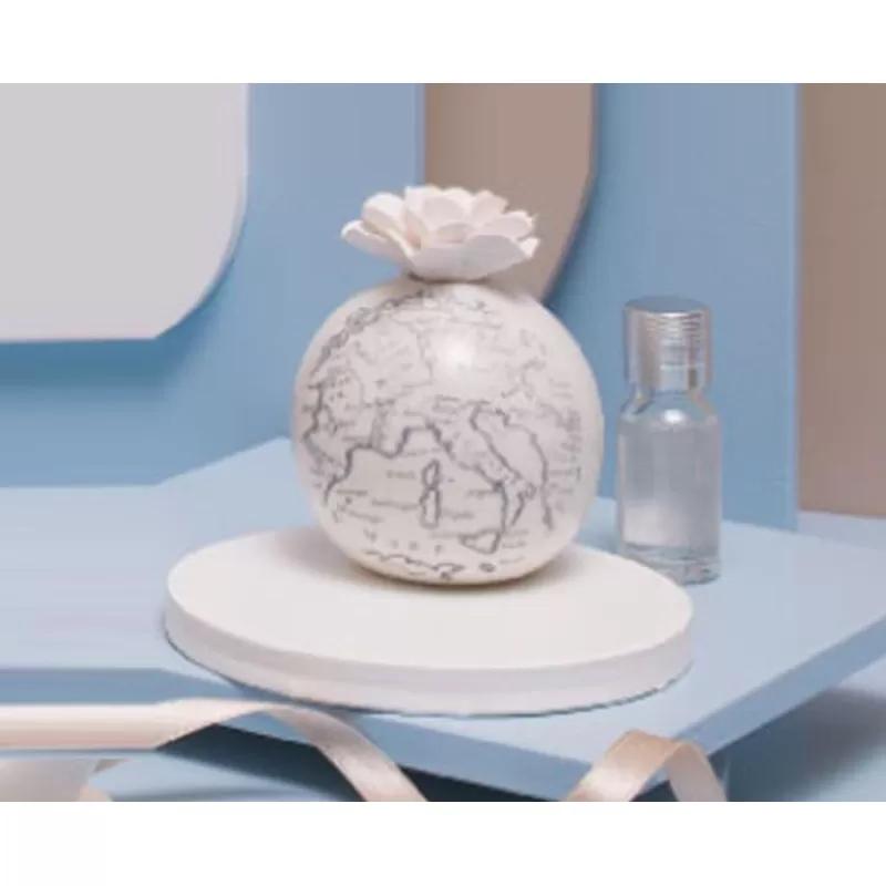 Bomboniera matrimonio claraluna 2021 profumatore mappamondo in porcellana bianca e mondo grigio con fiore gesso, incluso di kit essenza e astuccio.
