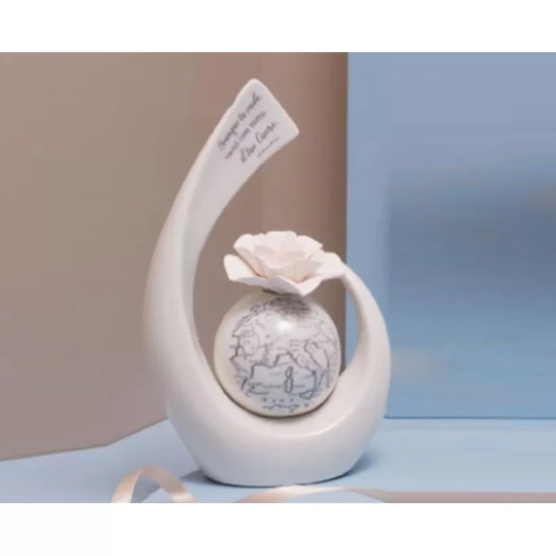 Bomboniera matrimonio claraluna 2021 profumatore mappamondo grande in porcellana bianca e mondo grigio con fiore gesso e frase "ovunque tu vada, vacci con tutto il tuo Cuore.", incluso di kit essenza e astuccio.
