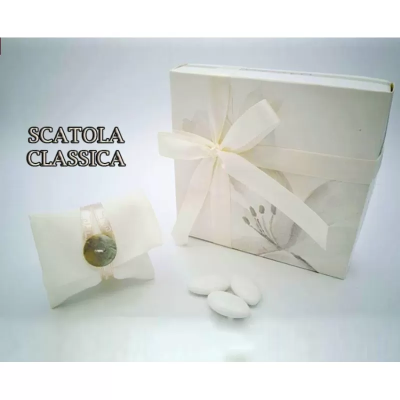 - 1 bomboniera confezionata già pronta con il nastro e il sacchetto come campione (solo con scatola classica).