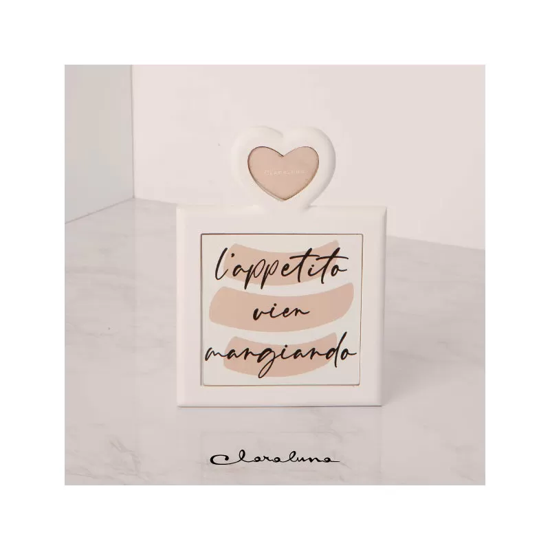 Bomboniera matrimonio claraluna 2023 sottopentola quadrato con scritta l'appetito vien mangiando in legno, con astuccio automontante giglio.