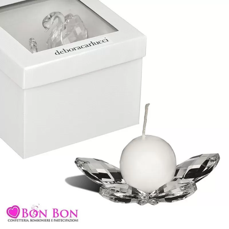 Bomboniera matrimonio debora carlucci 2021 porta candela piccolo 5 petali mm38 in cristallo inclusa di candela a sfera e astuccio con finestra trasparente.