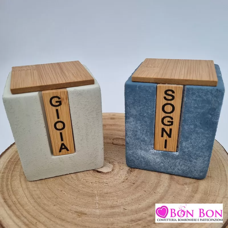 Bomboniera matrimonio candela in ceramica in 3 colori assortiti, con frase stampata nel legno, Gioia, Sogni e Amore.