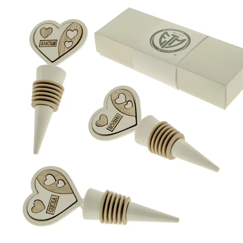 Bomboniera matrimonio tappo vino con cuore e decori in legno , inclusa di astuccio.