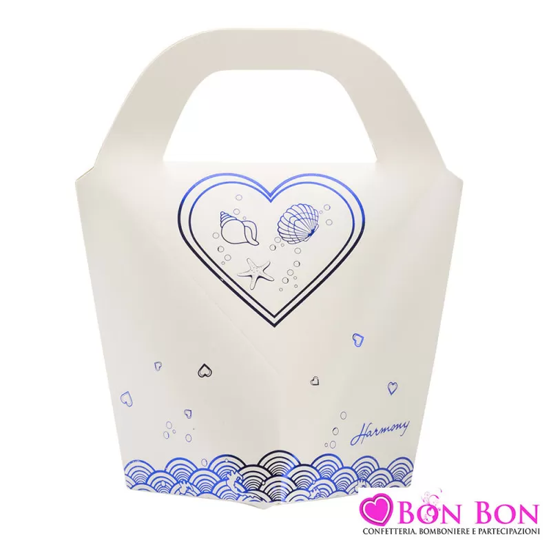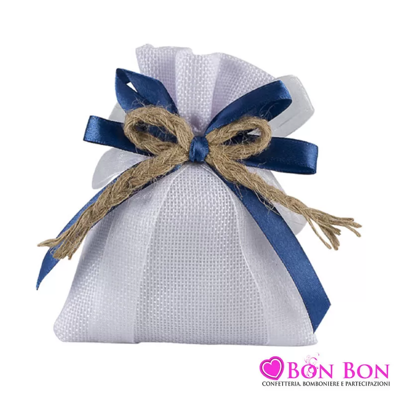 Incluso nel prezzo il sacchetto con fiocchi blu e corda, i confetti di gusto a scelta che saranno 5 per ogni sacchetto, la bustina per alimenti dove verranno inseriti i confetti e l'astuccio componibile.