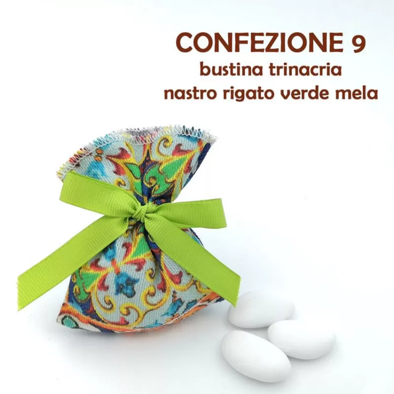 Possibilità di scegliere la confezione con scatola chiusa con nastro di colore a scelta e sacchetto con 5 confetti all'interno, o porta confetti trasparente.
