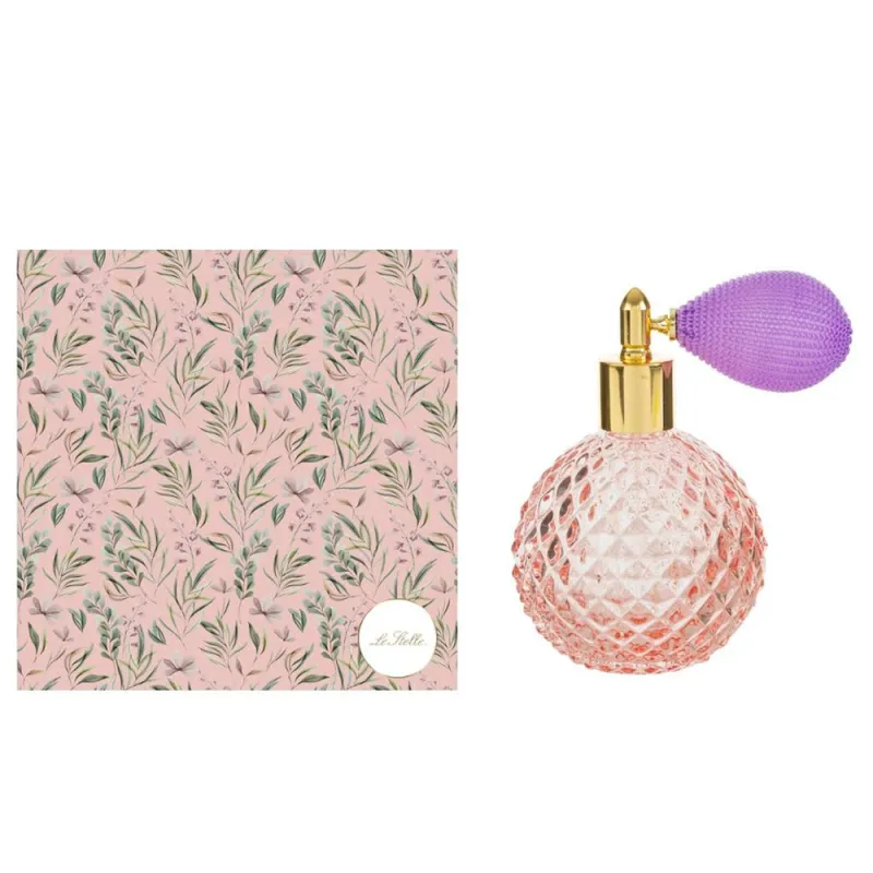 Questo portaprofumo è realizzato in vetro lavorato con motivo diamantato, che riflette la luce creando effetti preziosi e raffinati. Il formato da 100 ml lo rende perfetto come profumatore ambiente o per la biancheria, ed è completamente ricaricabile per un utilizzo duraturo. Disponibile in una gamma di colori vivaci e romantici – rosa cipria, ambra, verde salvia, trasparente e lilla – ogni flacone è dotato di pompetta spray in tessuto con finitura dorata, per un tocco vintage chic.