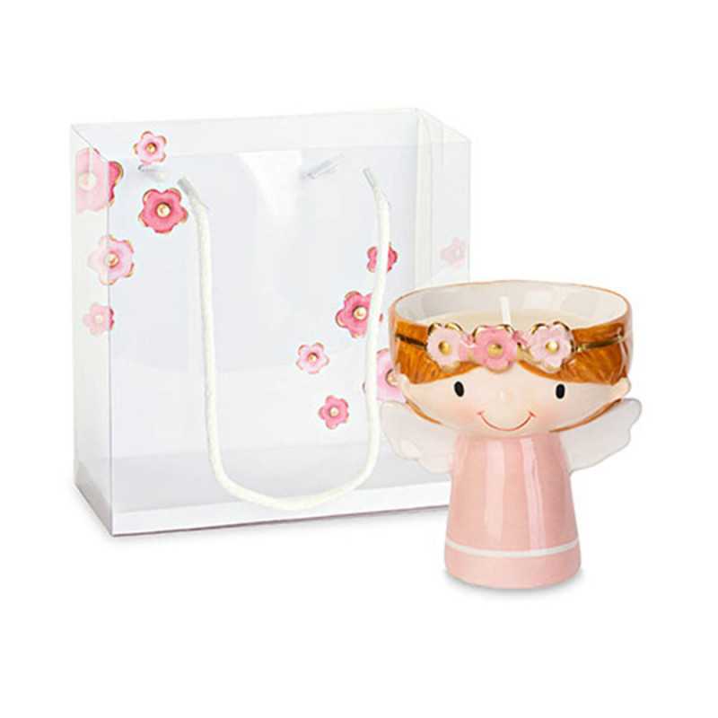 Bomboniere Prima Comunione Femminuccia Angioletto rosa in Porcellana con Candela e Ghirlanda di roselline e shopper inclusa