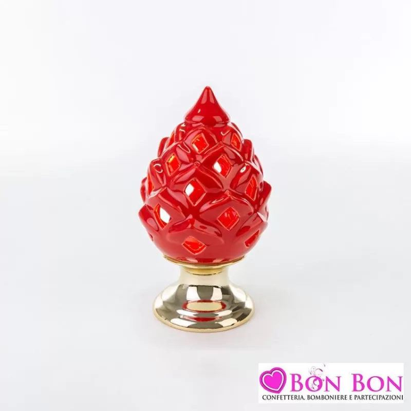 Bomboniera matrimonio pigna rossa con luce led e base dorata in porcellana senza scatola.