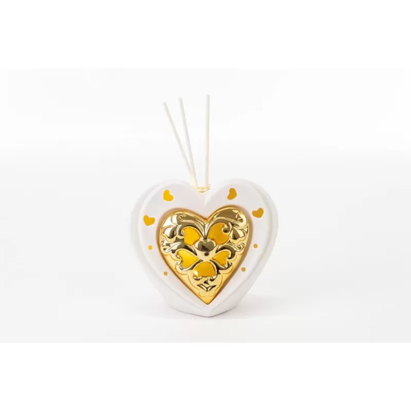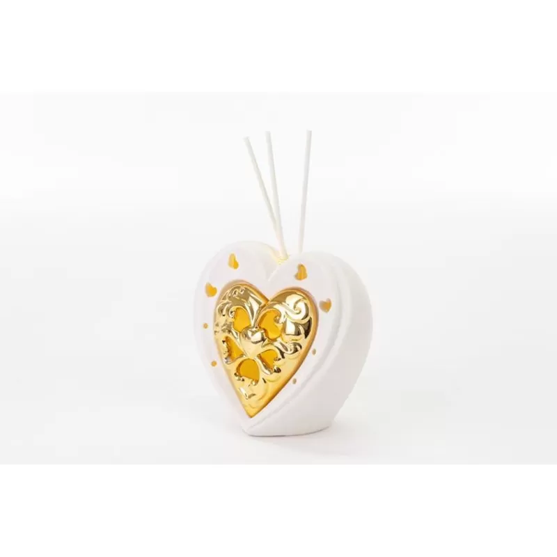 Bomboniera matrimonio profumatore cuore led bianco e oro porcellana inclusa di essenza e scatola le stelle.